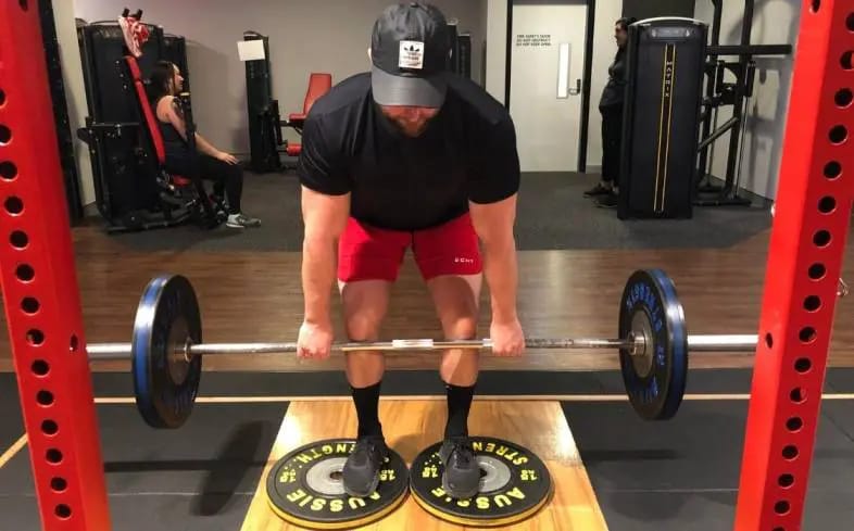 The lift looks almost identical to a regular deadlift. The difference is that the deficit makes the bar harder to break from the floor. Over time, this carries over to faster, stronger pulls when you return to the standard version.