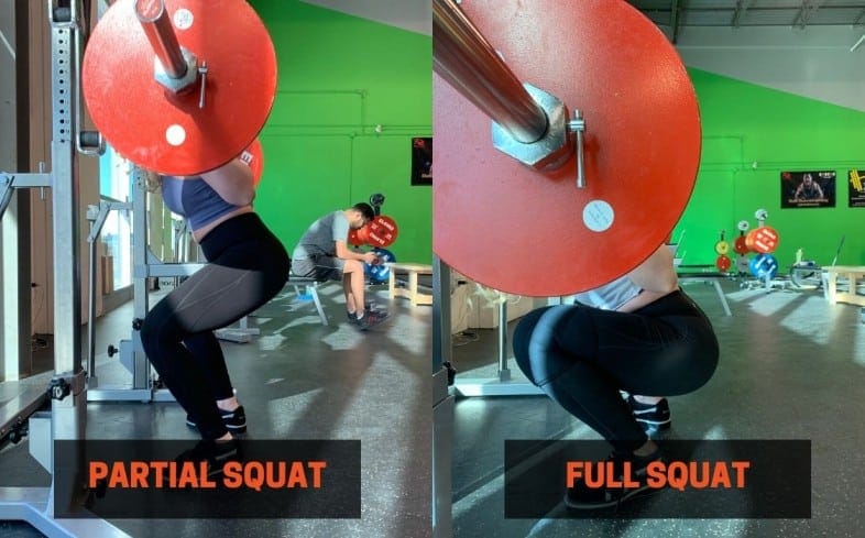 The ‘partial squat' is also called the ‘half-squat', which is where the knees don't go below 120-135 degree flexion. The glutes are activated more during a partial squat and heavier weight is typically used.